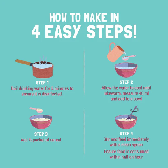 Boil drinking water for 5 minutes to ensure it is disinfected. Allow the water to cool until lukewarm, measure 45 ml (3 tbsp) and add to a bowl. Add 3 level scoops (20 g) of cereal. Stir and feed immediately with a clean spoon. Ensure food is consumed within half an hour.