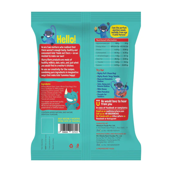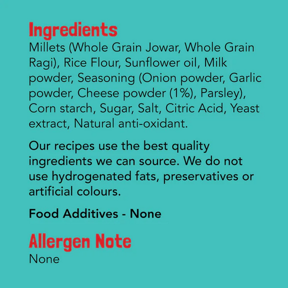 Made with Ragi and Jowar coupled with a lovely cheesy flavour and a hint of parsley, made from the best quality natural ingredients.