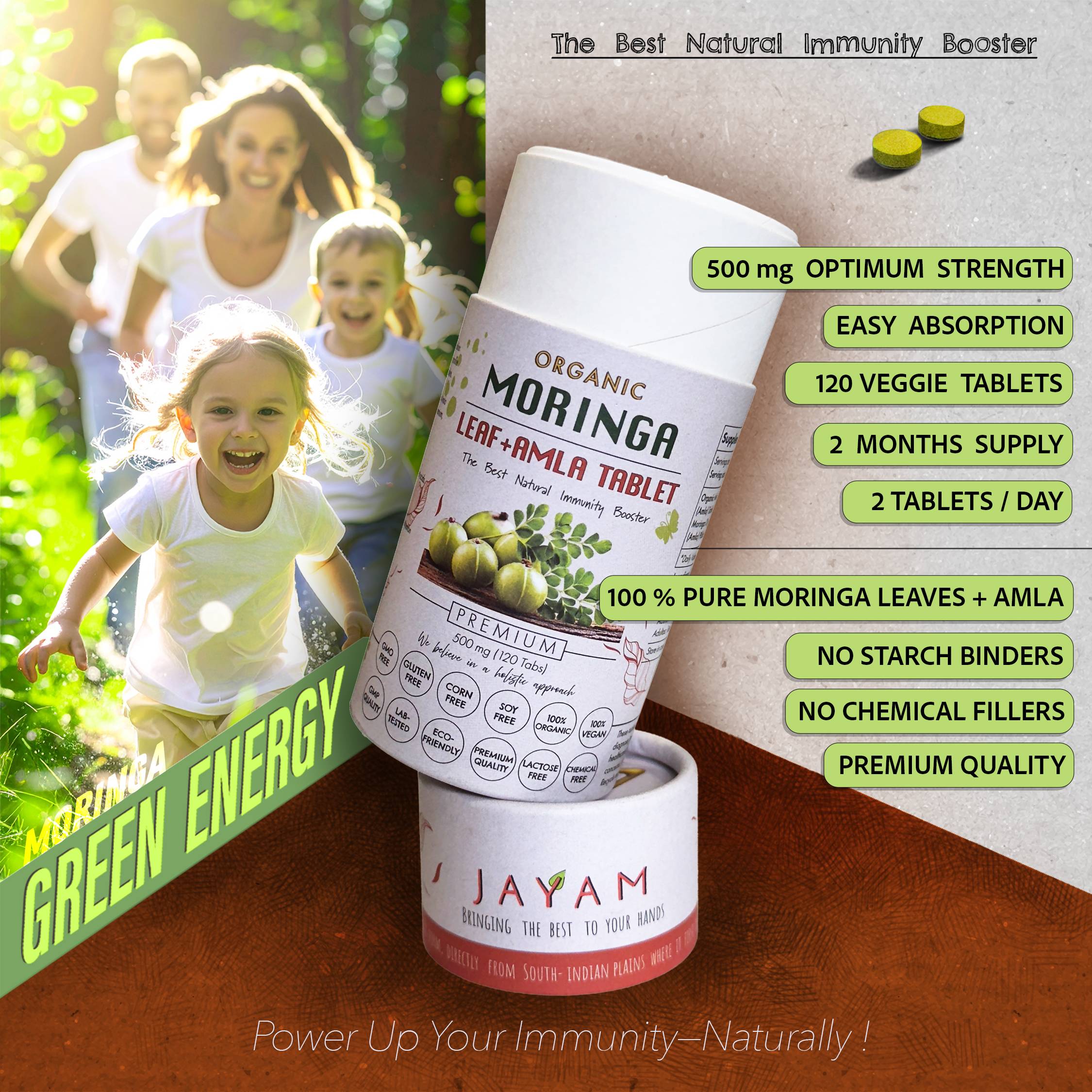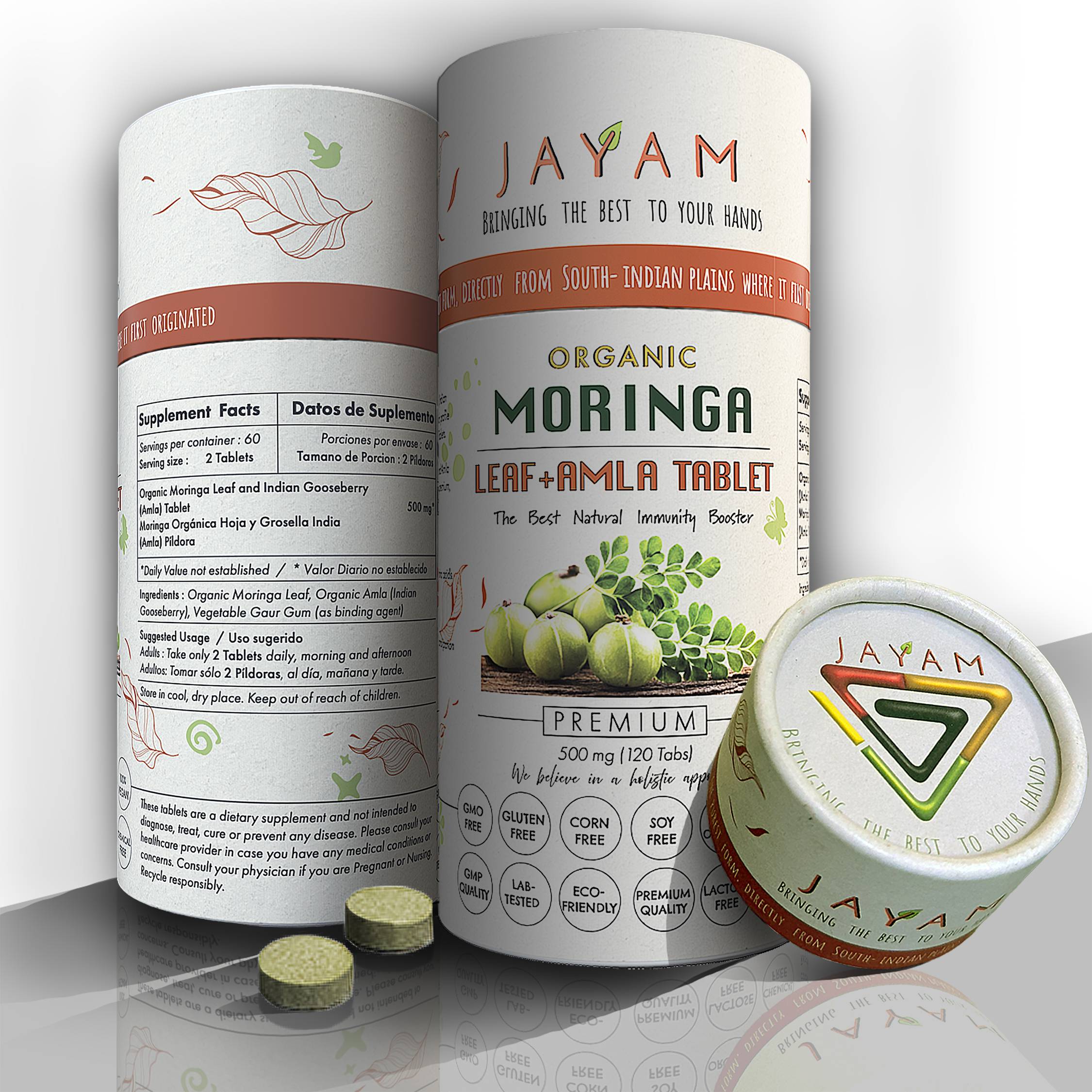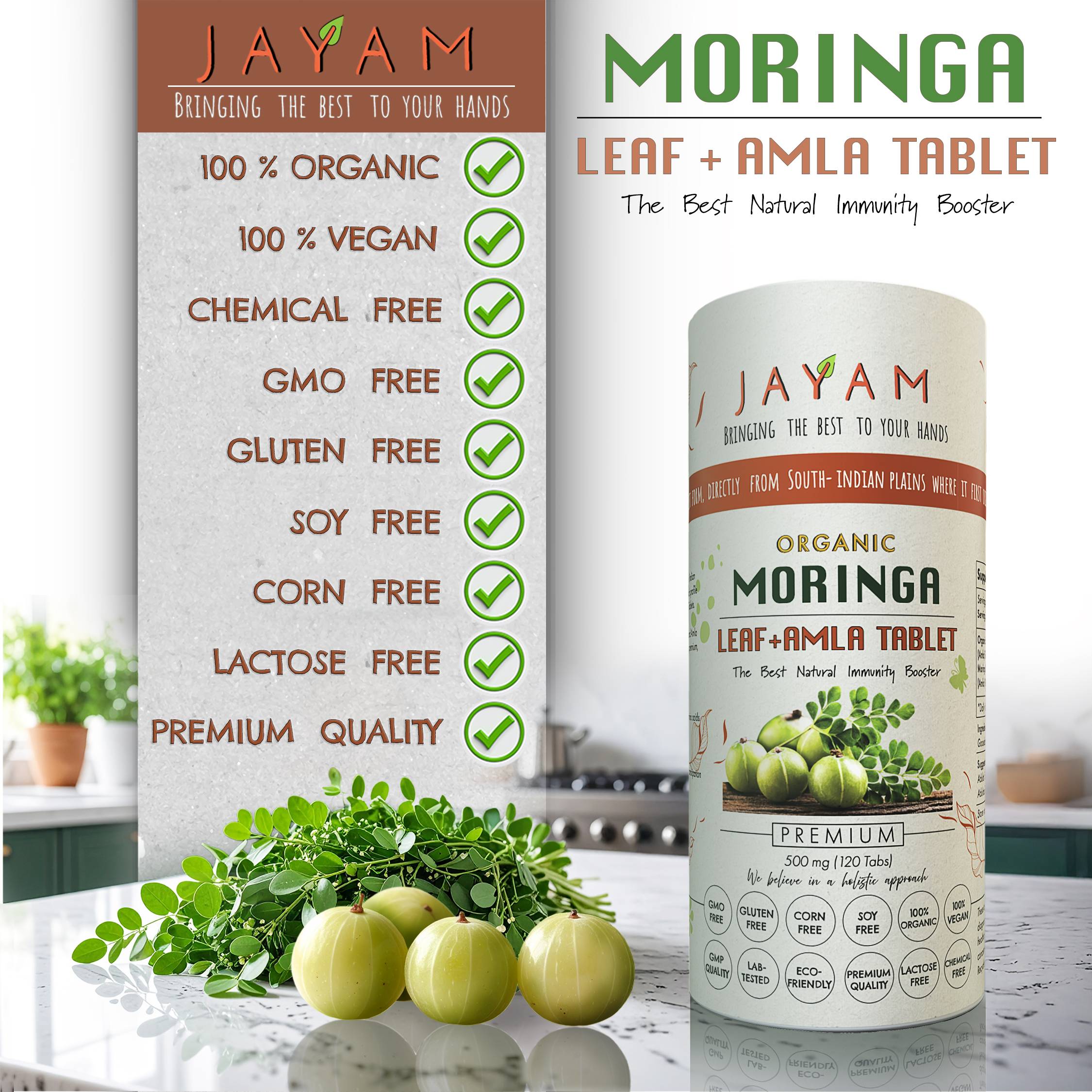 Jayam Organic Moringa Leaf + Amla Supplements – 500mg | Immunity Booster, Energy & Digestion Support | 120 Vegan Tablets | Pure, Sustainable Packaging