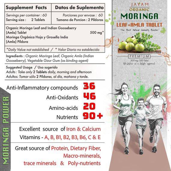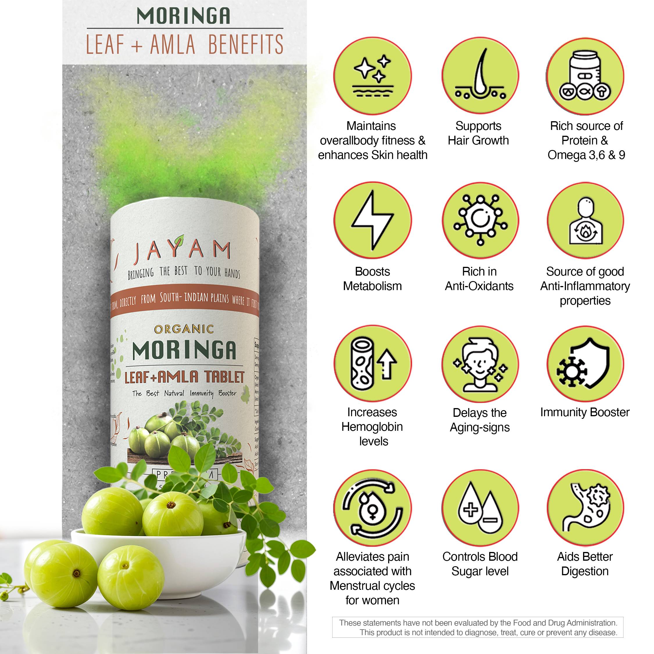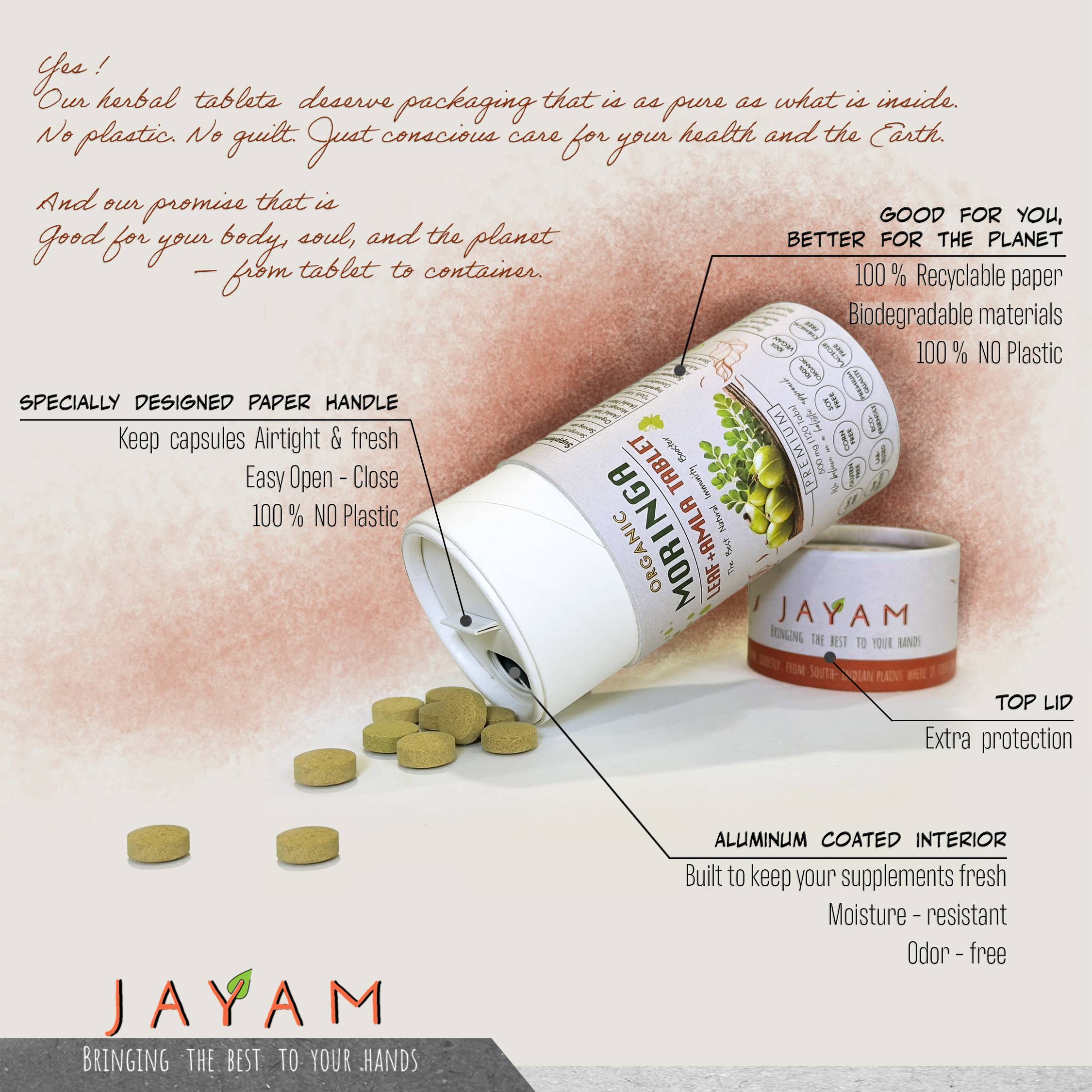 Jayam Organic Moringa Leaf + Amla Supplements – 500mg | Immunity Booster, Energy & Digestion Support | 120 Vegan Tablets | Pure, Sustainable Packaging