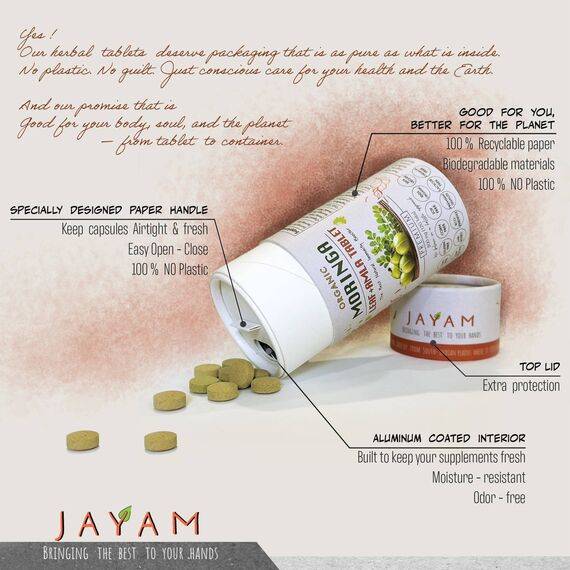 Ideal for anyone above teenage years seeking a potent, natural way to strengthen immunity and overall health. Each tablet delivers an optimal, easily absorbable strength of 500 mg of pure, hand-harvested botanical extracts with no fillers, no artificial additives, no extra coatings or artificial binders. Experience the synergy of nature’s best — clean, potent, and sustainably packaged by Jayam for your daily wellness.