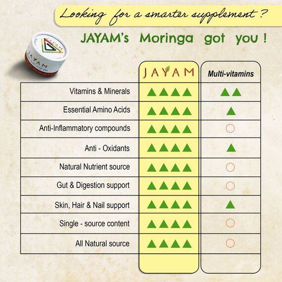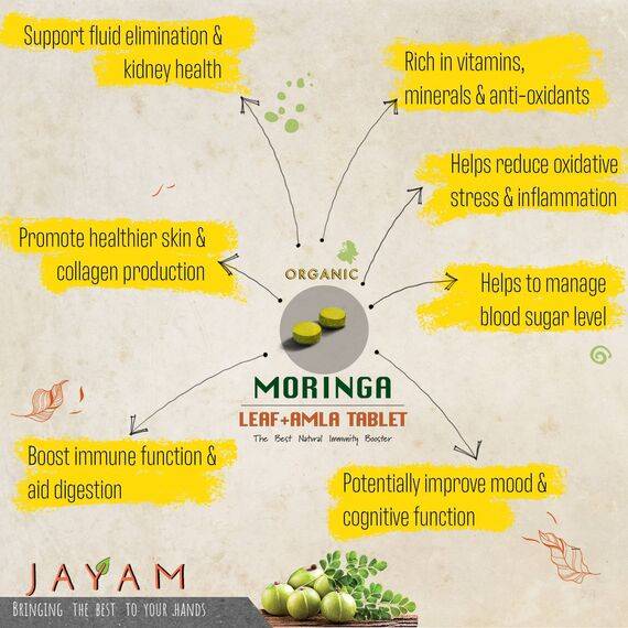 Elevate your wellness routine with Jayam’s Organic Moringa Leaf + Amla Tablets, expertly crafted to harness the combined power of two ancient superfoods.